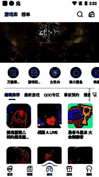 QooApp2025官方正版是一款专门针对二次元用户的游戏下载安装服务app。QooApp2025官方正版覆盖中英日韩等各类热门游戏,可以让玩家体验到真正的二次元手游。用户可以在这里及时了解日韩手游的最新资讯和动态,各地的手游都可以免费下载。无论你喜欢什么类型的游戏,都可以在App上找到。如果你也喜欢玩游戏,就来这个网站下载使用吧!