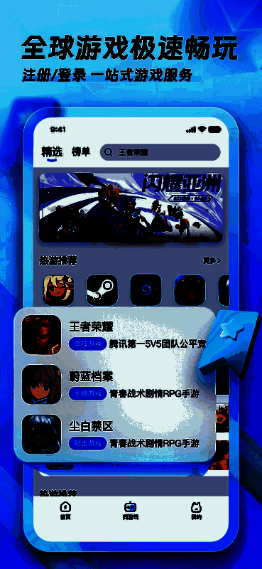 可以看出app的整体界面都十分的简洁,精选游戏界面可以看到目前热门的海内外手游都能看到,如果没找到想要玩的游戏,可以直接在主界面搜索栏输入游戏名后,就可以搜索到游戏,一键下载加速,解决手游登录异常,卡顿延迟高等多种网络问题。