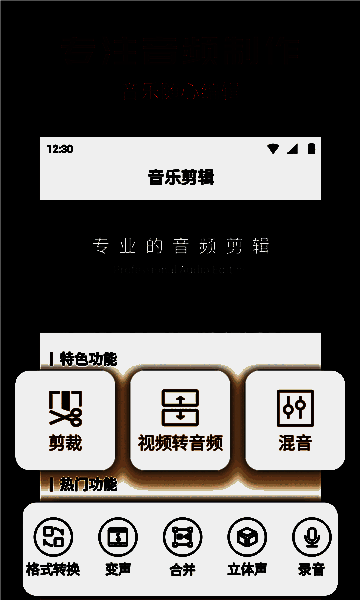 1.音乐编辑,支持音乐裁剪、格式化、混音、淡入淡出、立体声等操作。