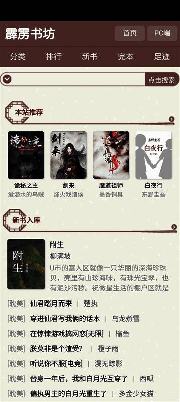 霹雳书坊app正版是一款简单上手的免费追书阅读软件,拥有丰富的小说书单和主题,可以让用户自由查看热门小说,经典小说,完本小说等资源,免费阅读喜欢的小说图书和最新内容,给用户带来优质的追书阅读服务和体验,还能轻松查看各种小说榜单,随时随地在线阅读看书,能完全满足用户的所有阅读需求,同时全新的小说阅读界面设计,随时查看各种精品小说,自由享受便利的小说阅读环境,轻松收藏喜欢的小说图书资源。