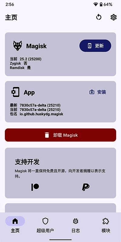 2、下载安装一下Delta版本Magisk安装打开,给ROOT权限。