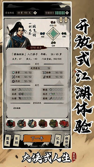 大侠式人生重制版官方正版是一个文字武侠游戏。玩家会经历一个从闯荡江湖的小喽啰到成为英雄的成长过程。你需要选择角色的门派,武功,性格特点。随着游戏的进行,玩家会完成任务,练习武功,结交江湖朋友,结婚生子,不断提升自己的实力和地位。玩家也能加入江湖势力,与其他玩家组队战斗,提升个人和团队的实力。感兴趣的朋友不要错过下载。