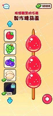 2、丰富的食物材料选择:从传统的山楂到各种奇异的水果,提供多种原料供玩家尝试棒上番茄的不同组合。