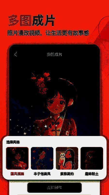 2、【多图一键拍摄】打造专属风格化视频——上传照片,AI一键打造风格化视频,支持超风格选择,帮你记录生活,呈现人像、风景、可爱宠物等精彩场景,支持一键高清导出,让生活更有故事感;