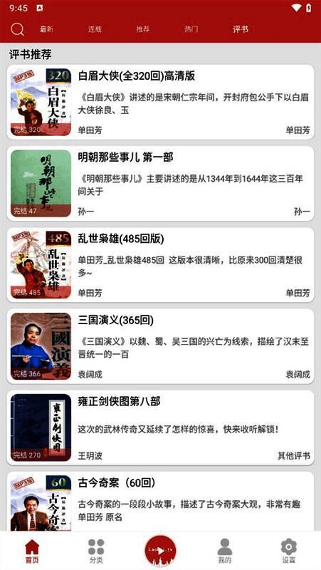 2、通过分类进行寻找:在底部点击“分类”,便会出现“评书分类”,根据用户喜好和需求选择评书讲解员。
