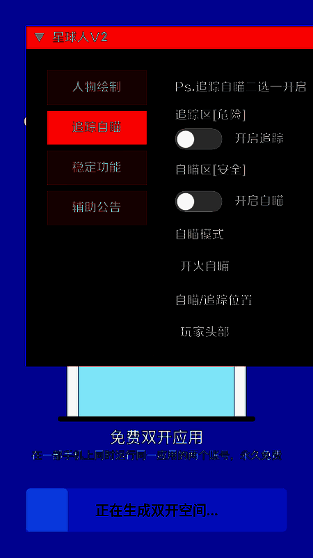 星球人直装 免卡密具有许多辅助功能,专为和平岛玩家设计。它可以一键解锁各种辅助功能,如人物绘制、跟踪和自瞄准、稳定性等,无需支付任何费用或生根,并且可以一键安装使用。星球人直装 免卡密适用于所有PUBG玩家,没有型号限制。如果你想使用它,你可以随时免费下载、安装和使用。