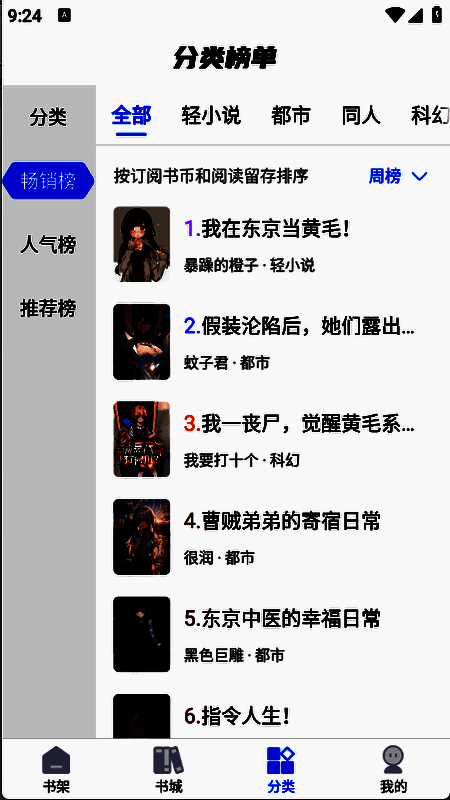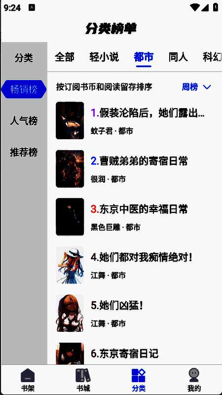 4、分类板块将小说进行了细致的划分,都市、言情以及科幻等类型都有。