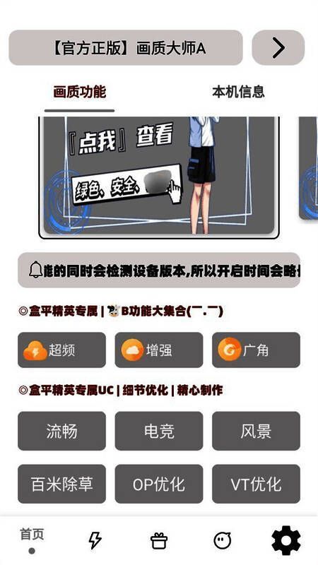 画质大师A官方正版免费下载是一款专业画质优化软件,我们的用户也是非常的喜欢这款软件的,可以帮助我们的用户更好的进行优化画质哦,提升用户的使用体验的,其次软件上拥有超多实用功能向我们用户免费提供使用的,并且这些功能还是非常的简单易操作的,符合用户多种需求哦,在画质大师A官方正版免费下载上还是可以一键设置各种参数哦,非常的便捷,有需要的小伙伴就来这里免费的下载吧!
