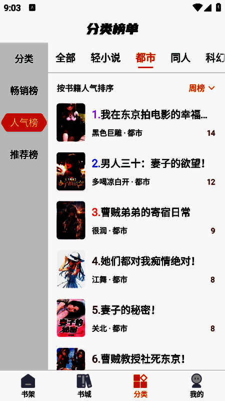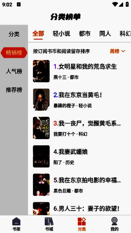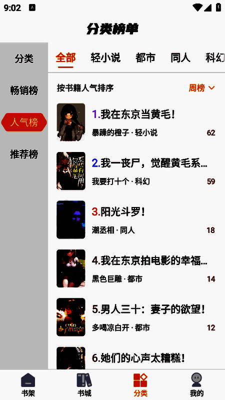 3、“分类”栏目将小说进行了详细的分类,都市、同人以及科幻等等。