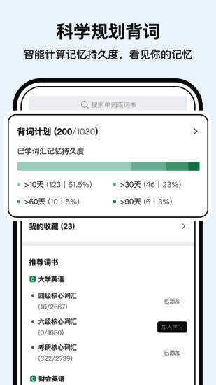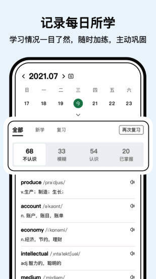 1.多种学习模式:本软件支持多种学习模式,包括拼写练习、记忆卡、语境使用等,用户可以通过不同的方式巩固学习内容;