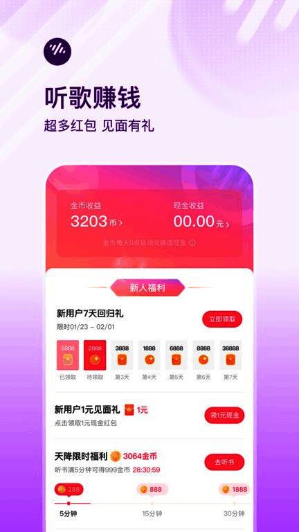 除了传统听歌看书功能外,番茄畅听音乐版还创新性地引入“金币任务”机制。用户在听书或听音乐的过程中可以积累时间、完成小任务获取金币,并最终兑换成现金提取,实现娱乐与收益双赢。