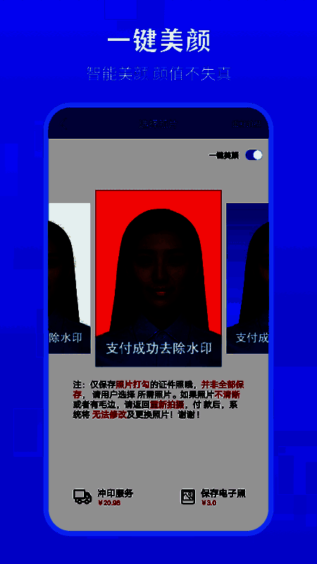 App内置实时美颜技术,能够智能识别面部轮廓,自动优化肤色、平滑肌肤并美化五官细节,让证件照看起来自然又精致;同时支持国家规定的多种标准尺寸自动裁剪,确保每一张照片都符合官方要求。