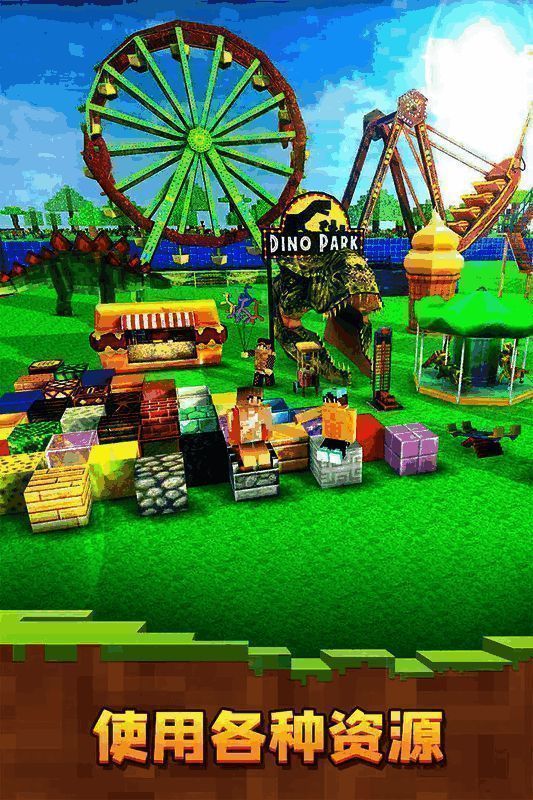1.玩家可以进入像素风格的乐园世界,自由布置各种设施。