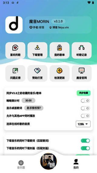 1、下载魔音morin打开,点击我的,有一个显示桌面歌词的选项