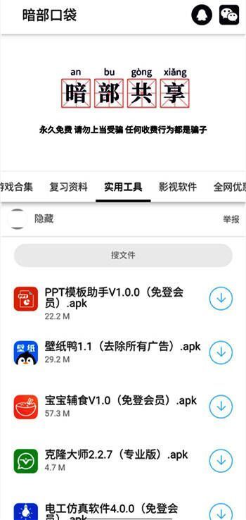 暗部口袋1.9最新版APP可以让大家在这里尽情下载各种资源。并且直接安装就可以免费使用了,操作起来很方便。你可以随时随地在线下载你最喜欢的软件。提供给您的所有软件都可以免费下载。不要担心下载。这个软件里的资源相当丰富,用户可以在这里找到自己需要的资源,还可以免费下载,软件里没有广告,而且这里你准备了很多的破解资源,软件对这些资源进行了分类,你可以通过关键词找到。