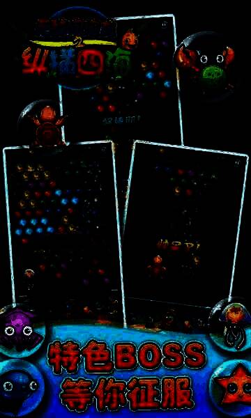 1、玩家通过点击屏幕控制发射器的角度和力量,射出泡泡,试图与屏幕上已有的相同颜色的泡泡连接并消除它们;