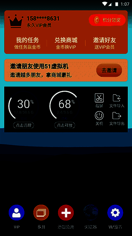 5.保护用户隐私:是一个独立封闭的虚拟环境,在虚拟机内安装恶意软件不会影响手机,保护用户隐私信息。