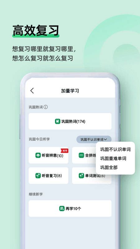 软件采用艾宾浩斯记忆曲线原理,智能安排复习节奏,帮助用户高效巩固所学内容。同时提供单词书、词汇表等实用工具,辅助用户制定合理的学习计划,确保每一个单词都能被牢牢掌握。
