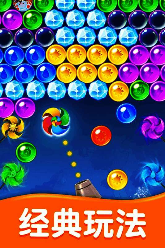 1、玩家需要通过拖动屏幕来调整泡泡发射器的角度,并释放泡泡,三个或更多相同颜色的泡泡会消除,获得分数;