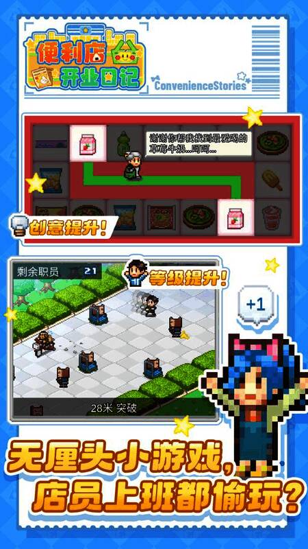 《便利店开业日记》是一款经营便利店的管理类手机游戏。玩家可以管理自己的商店,不断更新自己的产品,吸引更多的人,管理好我们的商店,逐步完善我们的业务。如果我们赚到足够的钱,我们可以购买更多的设备,更新更多的产品。