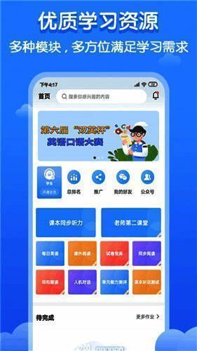 双英口语学生版是一款热门的英语口语练习软件,可以为用户实时更新丰富的英语视频和课程,随时让用户自由学习,还提供不同同难度场景的英语对话和文章,自由帮助用户轻松掌握更多的英语知识,随时让用户提升英语水平和能力,给玩家带来全面的学习服务和体验,还拥有提供了丰富的英语会话练习,用户可以与虚拟老师或其他用户进行实时对话,提高自己的口语表达能力,能完全满足用户的所有学习需求,还能自由查看各种英语学习资料。