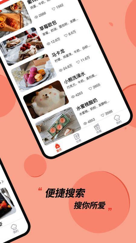 1、用户可以通过菜名、主要食材、辅料、烹调方法等多种方式进行搜索,方便快捷地找到自己想要的菜谱;