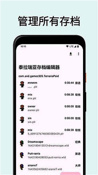 泰拉瑞亚存档编辑器官网版是一款专门为泰拉瑞亚手机版游戏制作的存档编辑器工具,用户不仅可以快速编辑泰拉瑞亚的存档文件,还可以快速获取存档文件并进行备份,让很多泰拉瑞亚玩家更好地玩游戏。