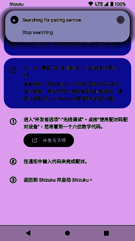 根据设备情况选择合适的服务启动方式,大多数用户推荐使用无线调试模式。启动后进入Shizuku应用完成配对流程,并输入配对码确认设备绑定。最后,在支持Shizuku的应用中开启对应权限,即可开始享受高级功能。