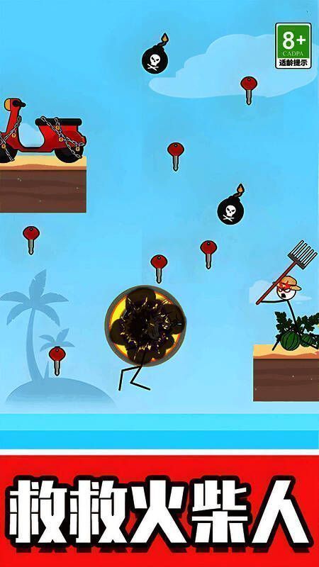 1、解谜冒险:每个关卡中都有一个火柴人被困的场景,玩家需要通过点击和拖动元素,解锁通路和道具,最终营救火柴人;