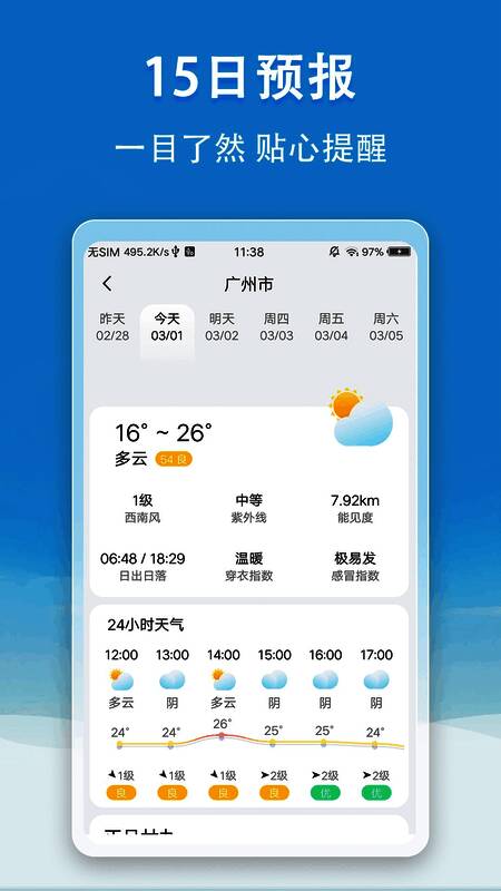 通过强大的定位系统,《小云天气》可迅速识别用户所在位置,并推送当地最精确的天气数据。无论是分钟级更新还是生活指数参考(如穿衣建议、紫外线强度等),都能满足不同场景下的使用需求。同时,应用内集成多种桌面插件,方便用户在主屏幕直接查看关键天气指标。
