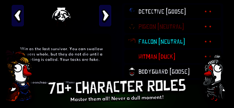 刺客 - 在会议投票阶段,可以通过正确地猜测角色来杀死一只鹅,如果你错了,你会死。