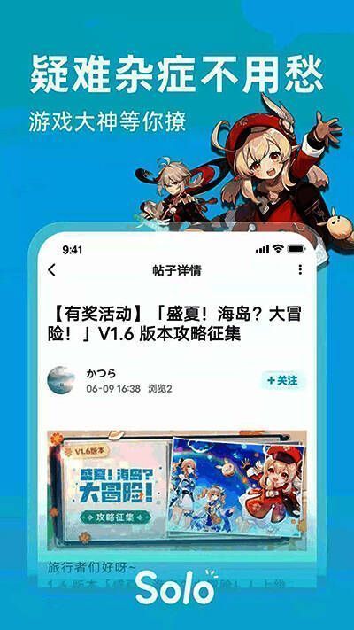 Solo游戏平台通过玩家自主生成优秀内容,聚集来自不同游戏圈的玩家,为游戏爱好者提供一站式交流和体验服务,并与喜欢同一游戏的朋友提供大量分享和交流机会。这里有最新版本信息、高质量的游戏指南、专家技术分享、有趣的日常生活等功能。你总是可以在这里找到你最喜欢的游戏圈。此外,还有一些官方游戏玩家加入了Solo游戏社区。除了了解官方福利外,您还可以有机会与策划者和制作人近距离沟通,让他们知道您对游戏的看法。感兴趣的朋友,快来下载并使用吧!