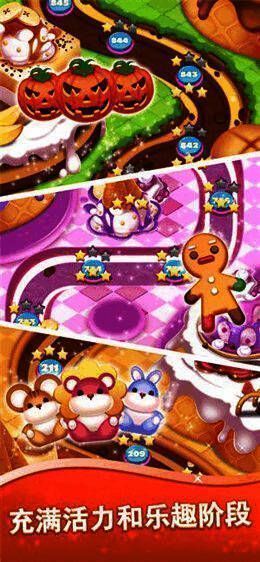 1、趣味三消玩法:玩家需要滑动屏幕,将相同的曲奇或糖果连成三个或以上,即可完成消除,达成关卡目标;