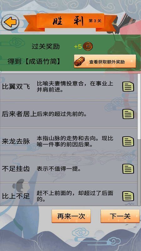 4、成语知识百科:游戏内提供了成语的详细解释和相关知识,玩家不仅可以玩得开心,还能学到更多的成语和其含义;