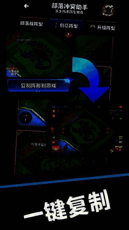 1、首选打开coc部落冲突助手,在首页点击下方复制阵型,下图箭头方向图标;