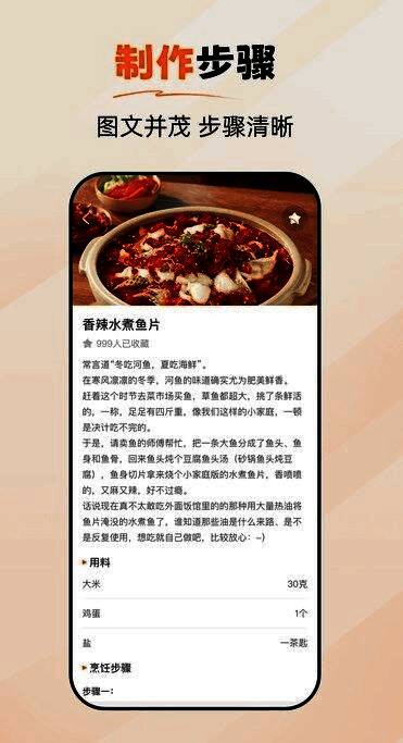 3、个性化推荐,满足多样化需求:根据用户的搜索和收藏历史,软件还可以智能推荐个性化的美食食谱,满足不同用户的口味偏好。