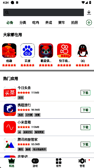 3、客户端提供多种分类排名和软件游戏管理功能。