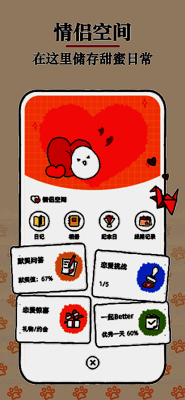 在Suki官服中,情侣可以通过多种方式互动,比如共同撰写恋爱日记、参与情侣挑战任务、记录专属回忆等。平台还提供了日常聊天、定时提醒以及趣味问答等功能,极大地丰富了情侣间的沟通方式,让每一对恋人都能在虚拟世界中构建属于自己的甜蜜小屋。