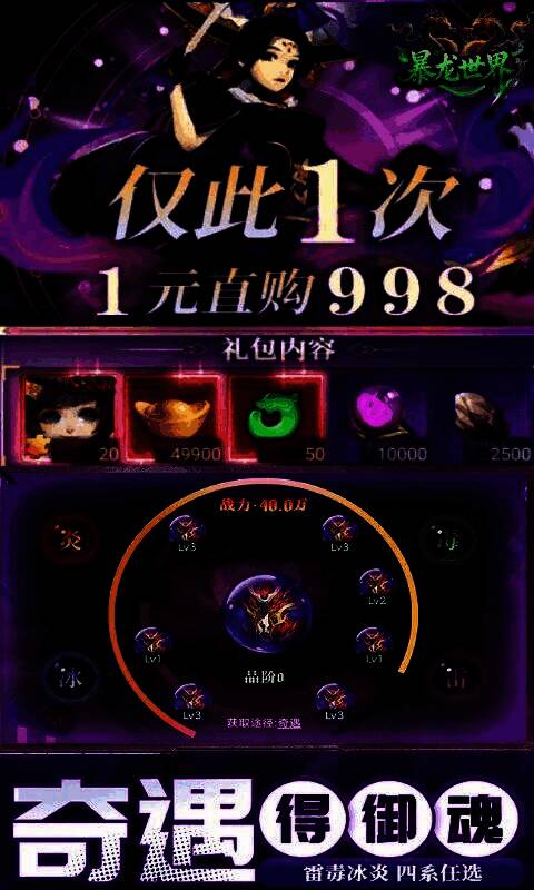 《暴龙世界》以“策略+爽感”双核驱动,重构卡牌战斗体验。游戏引入火、雷、毒、冰四系仙将,属性相克形成战术闭环,每位角色拥有独立技能与合击技,搭配阵容可激活《命运圣契》式英雄羁绊,智取强敌。