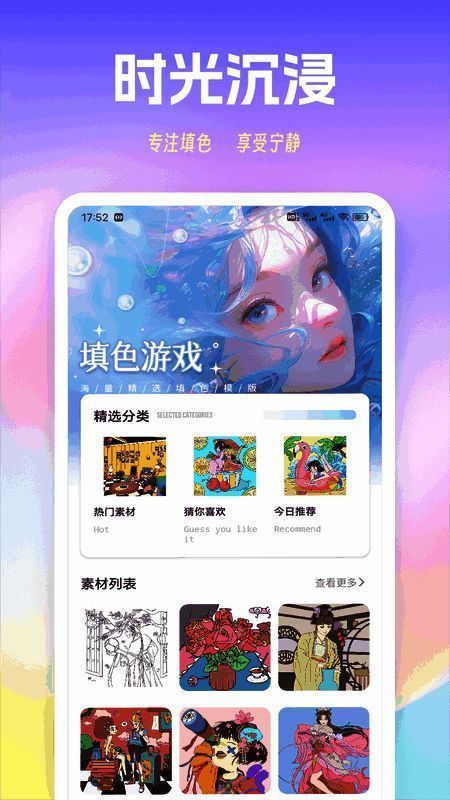 《色猫涂色》内置超5000+幅可涂色素材,涵盖国风仕女、山海经神兽、日系萌娘、都市插画等多种风格,并持续每周更新主题合集。同时提供百款风格化头像模板与高清壁纸设计模块,支持自定义分辨率与背景纹理,适配主流手机型号屏幕尺寸,满足个性化设备装扮需求。