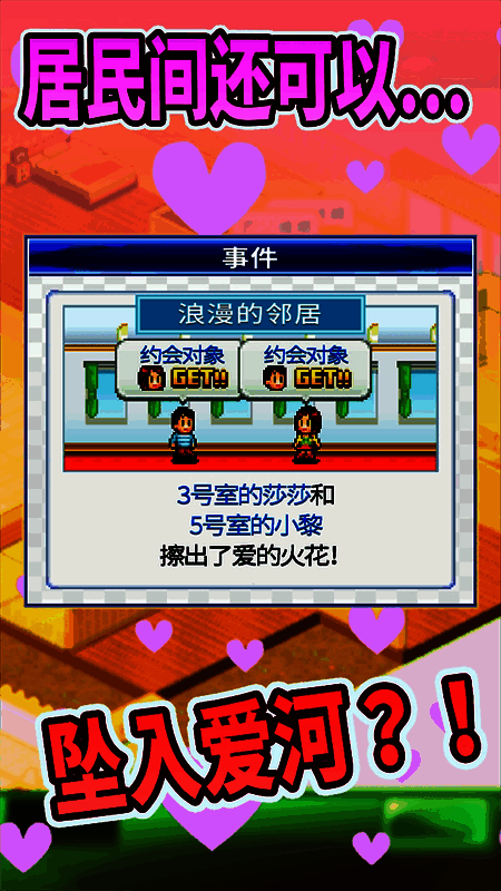 幸福公寓物语2025最新版是一个模拟经营游戏。在游戏中,玩家将扮演房东的角色,经营公寓,需要为房间布置舒适的家具,招募住户入住,并在入住后管理住户的能力,帮助他们顺利找到工作和谈恋爱,在你的小公寓里结婚生子,打开幸福生活的大门。游戏的界面依旧采用了pixel风格,虽然看起来有点粗糙,但是在细节和人物表情上非常丰富生动。感兴趣的朋友不要错过下载。