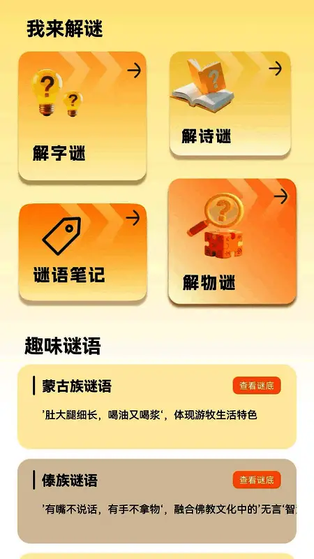 《答题喜洋洋》从汉字玄机到诗词意境,从日常物品到文化典故,每道谜题都融入了趣味巧思,考验玩家的识字功底与联想能力。无论是语文基础薄弱的新手,还是热爱传统文化的资深玩家,都能在游戏中找到适合自己的挑战。