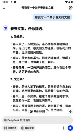 Deepseek 360专线版支持文字输入、语音识别、图像识别(拍照搜索)以及视频内容分析等多种搜索方式,真正做到全场景覆盖、全感官交互。无论是在通勤途中语音提问,还是通过拍摄实物进行辨识,亦或是在撰写文案时寻求AI辅助,软件均能迅速响应并给出高质量反馈。此外,内置写作助手、翻译引擎、数据分析、旅行规划等实用AI工具,全面赋能用户在教育、办公、生活等多个维度的应用需求。