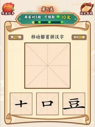 核心玩法围绕汉字结构展开,包含部件重组、音形义辨析、成语填空等高互动性环节。完成特定任务即可触发“红包雨”彩蛋,观看短广告还可额外获取翻倍奖励。更设有家庭共玩模式,支持双人协作闯关,推动亲子互动与汉字启蒙同步进行。