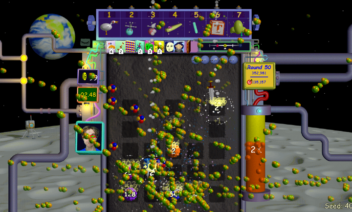 游戏首创「弹跳生成 × 合成管理 × 结构维稳」三重循环机制:玩家不仅需预判纳比的弹道轨迹以精准撞击关键钉子生成初始数字,更要实时调度下落数字在有限格栅区内的移动路径,借鉴《2048》逻辑完成相邻同值数字合并——稍有疏忽,格栅溢出即触发全厂级爆炸动画。这种将弹珠台的爽感、2048 的烧脑与 Roguelike 的不可逆成长深度缝合的设计,被 Polygon 评为“2024 年最具实验精神的机制融合范本”。