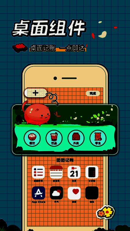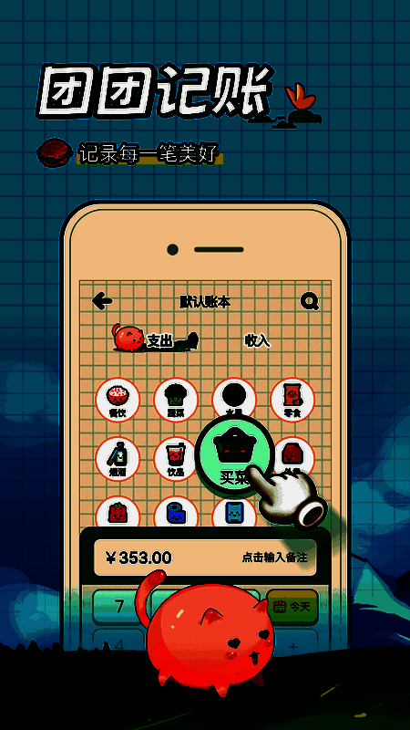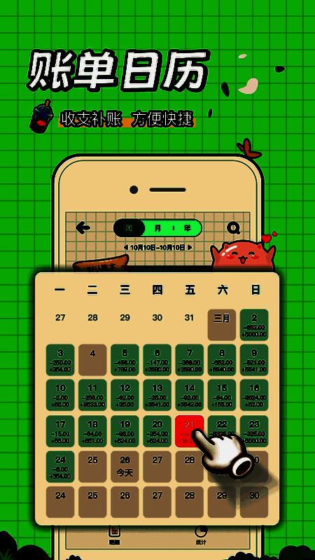 记账app界面展示,主屏幕显示可爱的虚拟角色与简洁的记账按钮">