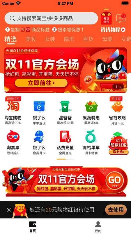 《悦淘汇》每日更新大量特惠商品,确保实惠不断档。同时,平台支持灵活的商品分类浏览,并通过个性化推荐系统为每位用户精准推送适合的商品。此外,购物返利比例高达90%,甚至与饿了么联动推出红包返现活动,进一步提升了用户的购物体验。