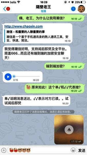 除了基础的加密聊天功能外,《潮信》还提供了多项便捷服务。例如,用户无需申请添加好友,打开应用即可与通讯录联系人聊天;支持一键召唤好友上线,确保重要信息即时传达;并提供消息已读未读状态显示,让沟通更透明可控。