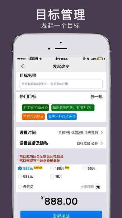 在《达目标》中,你可以发起一个目标并缴纳押金,邀请好友或平台用户作为监督人进行监督。如果成功完成目标,押金将全额返还;若中途放弃,则押金将分配给监督者和围观支持者,形成一种正向激励机制。此外,每日签到功能支持文字、图片等多种形式记录进度,增强参与感和仪式感。