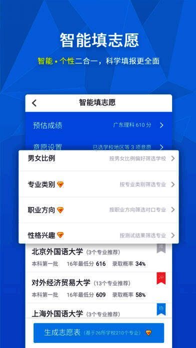 基于个人成绩、性格倾向、兴趣类型及就业前景等多元因素,《完美志愿》可自动生成个性化志愿方案,真正实现科学决策、智能匹配。